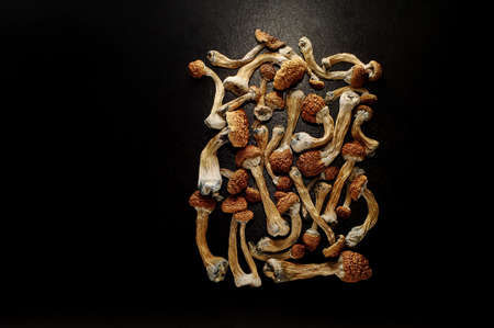 Psilocybin mushrooms on black background. Psychedelic, magic mushroom Golden Teacher. Medical scientific usage.