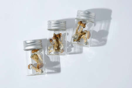 Psilocybin psychedelic magic mushrooms in glass jar on white background. Psilocybe shrooms