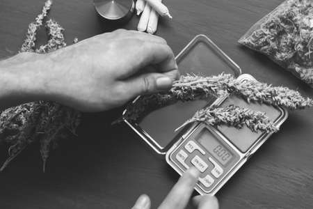 buds Cannabis Marijuana in hand on Weighs On the scales on the table and joint on table in a moody green tone