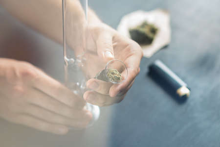 Clear glass bong. Smoking marijuana at home.