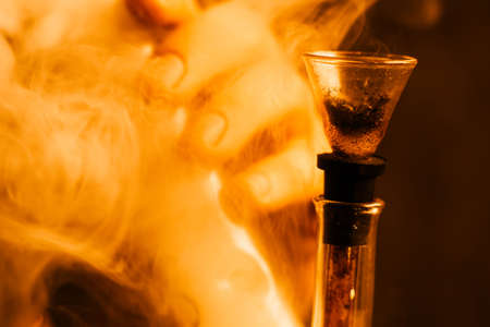 A man smokes cannabis weed, a bong and a lighter in his hands. Smoke on a black background. Concepts of medical marijuana use and legalization of the cannabis. On a black background