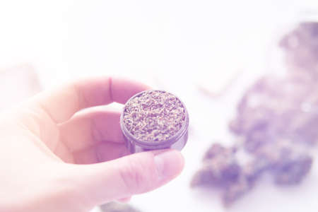 grinder with fresh weed in hand, close up joint with marijuana, Cannabis buds on white table, light leaks color tones