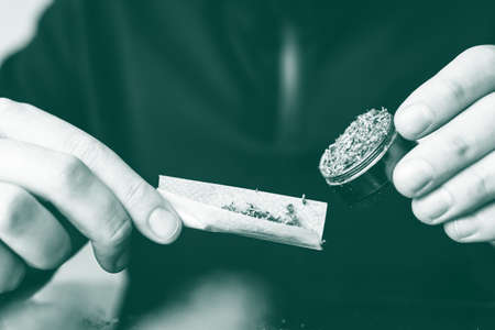 Man rolling a marijuana weed blunt. Close up of addict lighting up marijuana joint with lighter. Man preparing and rolling marijuana cannabis joint. green toned