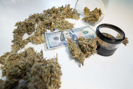 Money weed. Marijuana bud and banknotes of dollars. Cannabis in Economics. CBD THC herb. The pot buds. Cannabis money black market. White background. Sativa medical health.