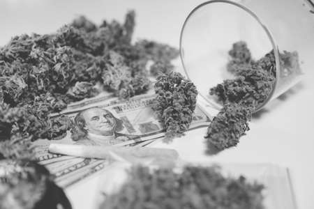 The pot buds. Money weed. Cannabis money black market. Marijuana bud and banknotes of dollars. Cannabis in Economics. White background. CBD THC herb. Sativa medical health. Black and white.