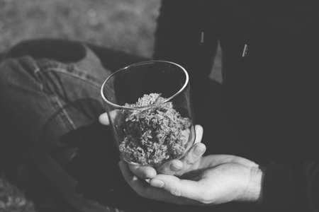 Sativa THC CBD. Cannabis nature bud in hand. Indica medical health. Marijuana weed bud and grinder. Natural background. Black and white.
