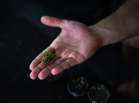The man twists the canth from fresh marijuana