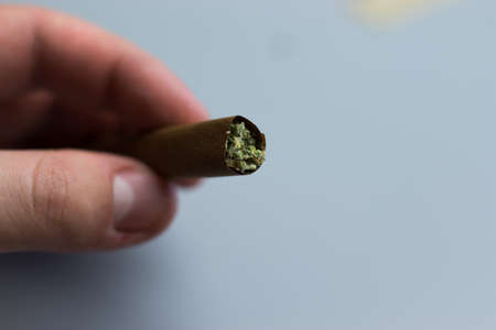 Cannabis blunt in hand close-up. Copy space background for text.
