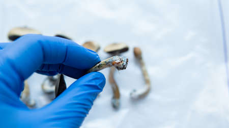 psilocybin mushrooms lying in male hands in blue medical gloves