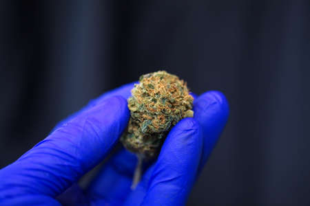 close up scientist hand gloves checking hemp plant. Concept herbal alternative medicine, cbd