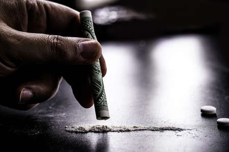 Close up of drug addict snorting cocaine