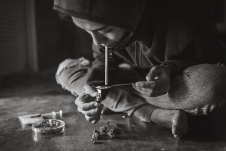 Addict/junkie man preparing drugs. The concept of crime and drug addiction.