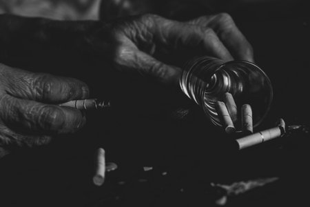 Cigarettes a glass and an empty bottle and the hands of an old woman on a burnt black table, female smoking and alcoholism, bad habits