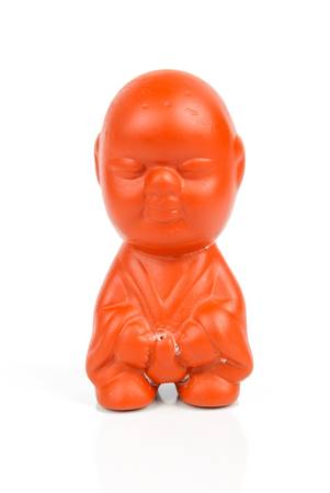 Mini Buddha child smiles peacefully. Mini monk statue with green mantle isolated on white background.