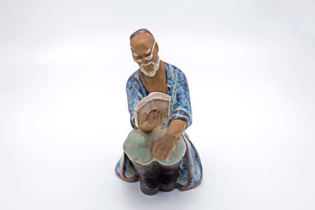 Chinese Old Man Reading Book Statue Isolated on White Background