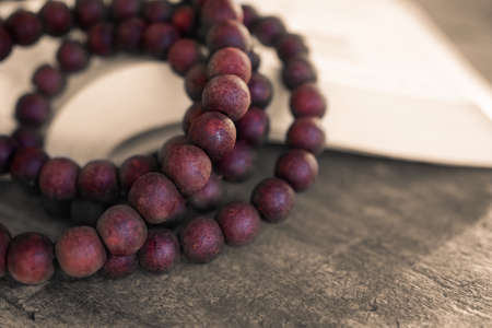 Praying beads on the wooden ground