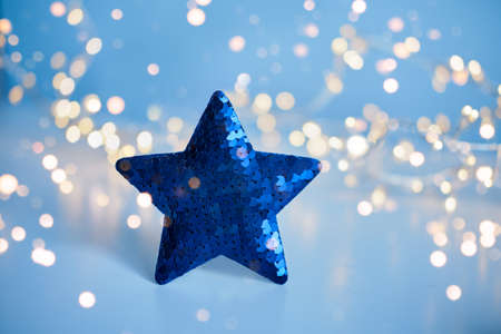 Blue sequins Christmas star with blurred gold lights background