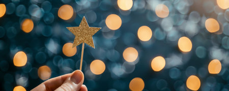 A shimmering gold star ornament held delicately by a hand, surrounded by soft holiday lights that create a magical and warm atmosphere perfect for Christmas celebrations.