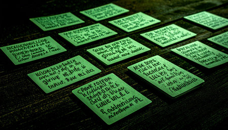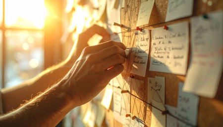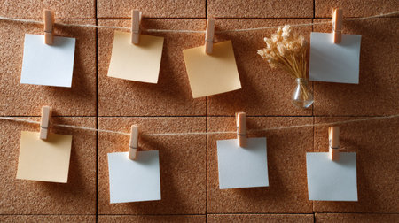 Handwritten yellow notes filled with reminders and ideas are pinned on a corkboard in a workspace, creating an organized yet creative environment.