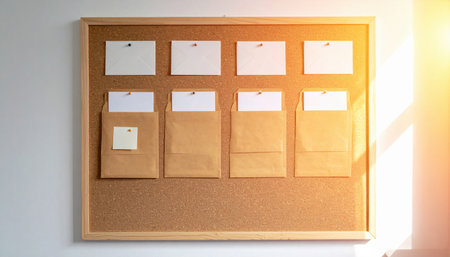 cork board with tidy envelope pockets blank labels soft window glow negative space minimal office wall