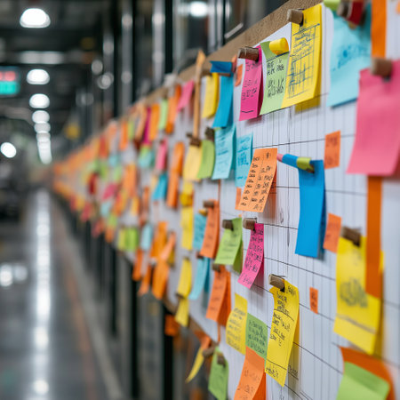 Vibrant notes cluster on a bustling workspace board, reflecting organized chaos and dynamic project planning amid productivity.