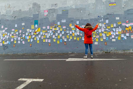 11/18/2018, Moscow, Russia. A young woman wearing a red jacket is standing near the wall with numerous adverts.