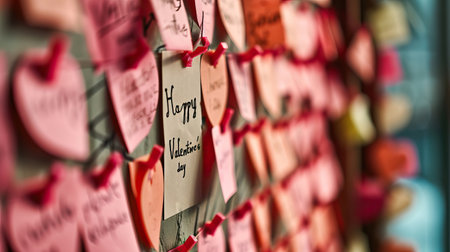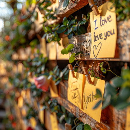 A colorful wooden wall is adorned with handwritten love notes on yellow paper. Green vines and plants surround the notes, creating a warm and inviting atmosphere for visitors to enjoy..