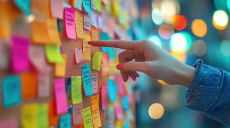 A hand is pointing at a wall covered in colorful sticky notes..
