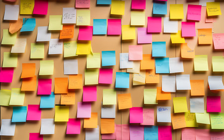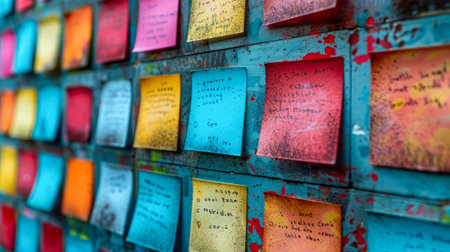 A visually appealing image of a corkboard covered in a diverse array of sticky notes in different colors, featuring handwritten notes, doodles, and reminders. The notes are densely packed and vary in size, creating a vibrant and dynamic display.