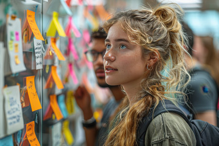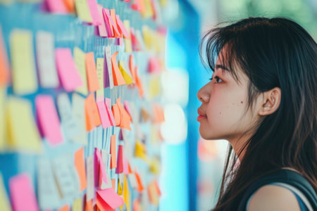 A girl is looking at post it whiteboard bokeh style background