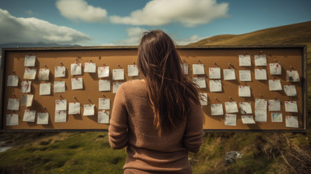 Unveiling the Mosaic of Ideas: A Woman Engulfed by a Neural Network's Photorealistic Sticky Note Wall - AR 3:2
