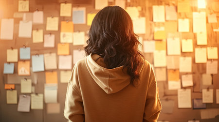 A young woman stands before a colorful wall adorned with an eclectic mix of notes and images. She gazes thoughtfully at the artistic display, capturing the essence of creativity and inspiration in an urban setting.