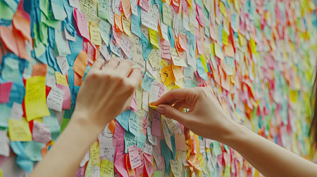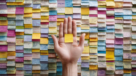 A vibrant scene featuring a hand holding a single yellow note against a backdrop of colorful sticky notes. This image symbolizes organization, creativity, and the flow of ideas in a workspace.