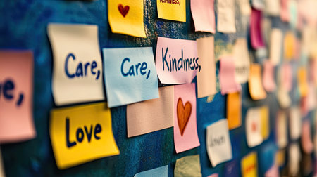Post-it notes with positive words like Kindness, Care, and Love stuck on a wall, leaving room for World Kindness Day text