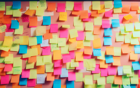 A vibrant display of sticky notes lines the wall of a creative workspace, reflecting diverse ideas and thoughts. Each note contributes to a collaborative environment.