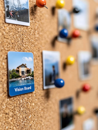 A macro photograph capturing the intricate details of a vision board with handwritten goals, dream destinations, and personal aspirations. The vibrant textures and colors bring creative visualization to life.