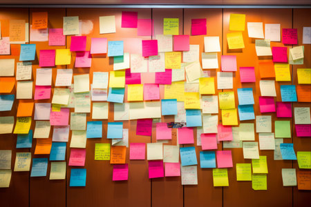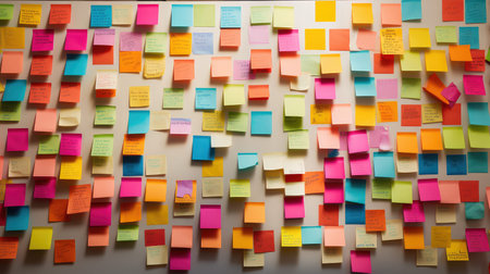 Sticky notes board in office. Many different colorful paper stickers pinned on wall. Memory notes for business planning. Created with Generative AI