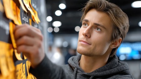 A man using sticky notes for strategic planning. Concept Strategic Planning, Using Sticky Notes, Office Environment, Business Strategy, Success Tips