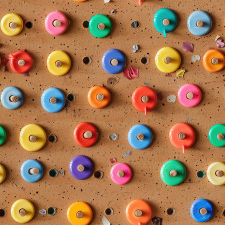 This image shows a close-up of a wooden peg board with circular pieces of different colors, arranged in a grid pattern. The pieces are all brightly colored, and some of them have small wooden pegs protruding from their centers. The board is made of wood and has a rustic texture.