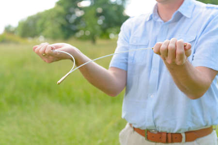Man dowsing wirh dividing rod to locate ground water under surface or currents of earth radiation to check home for safe zones