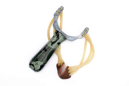 Steel, sport fishing slingshot with triple harness. Hunting slingshot on a white background. Slingshot made of metal with elastic bands.