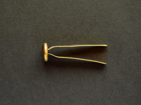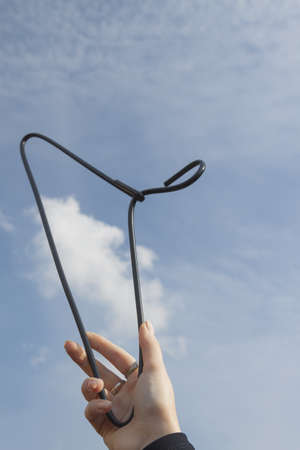 Two dowsing rods for the radiesthesia technique, lie on the stump of an old tree. Dowsing with metal indicator L rods is a modern tool of a dowser