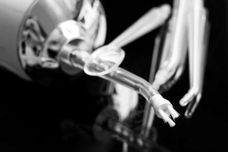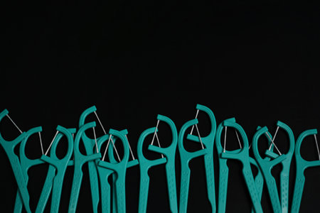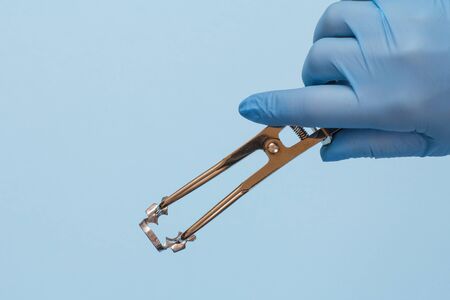Dentist's hand in a latex glove with dental tongs and clasp on blue background. Medical tools concept.