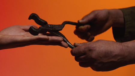 Concept of barter. Stock. The concept of barter and trust: the human hand giving a tool in the hand of another person