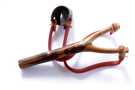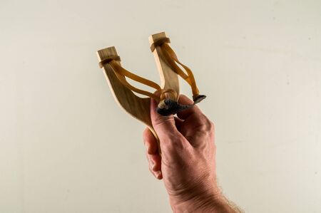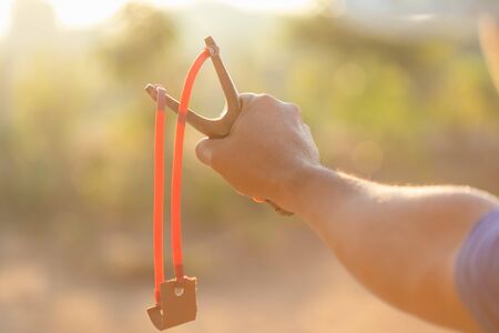Close up man playing slingshot or catapult in morning time with sunlight effect