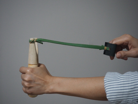 Thai slingshot that has green rubber band was shooting by someone and it is in front of grey background.