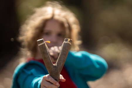 Portrait of a child aiming. Funny childhood. Kids game with a slingshot. Kids handmade slingshot. Kids toy sling in hand. Shooting kids game. Kid with a catapult.