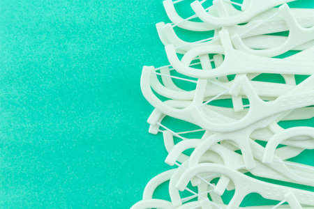 Fluffy white cotton buds organic bamboo chaotically lying on green background. Eco friendly, zero waste, ecology. Top view, closeup.