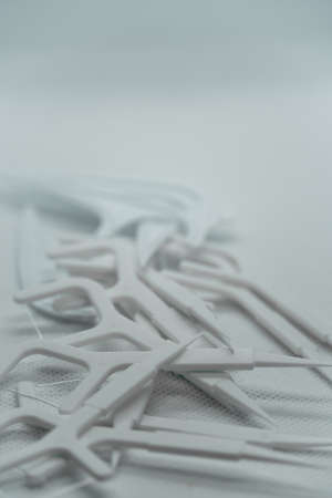 Teeth crows for implantation with dental tooth extraction forcesps on white background. Professional Dentist desktop, top view.