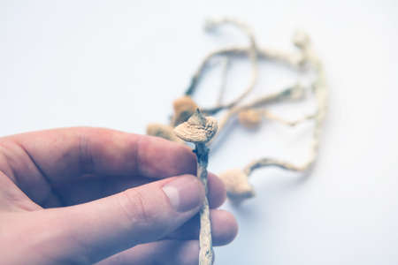 Psilocybin mushroom. White background. Psilocybin Mushroom. Albino A strain. Psychedelic drug. Close up Magic shroom. Dry Psilocybe cubensis in hand.